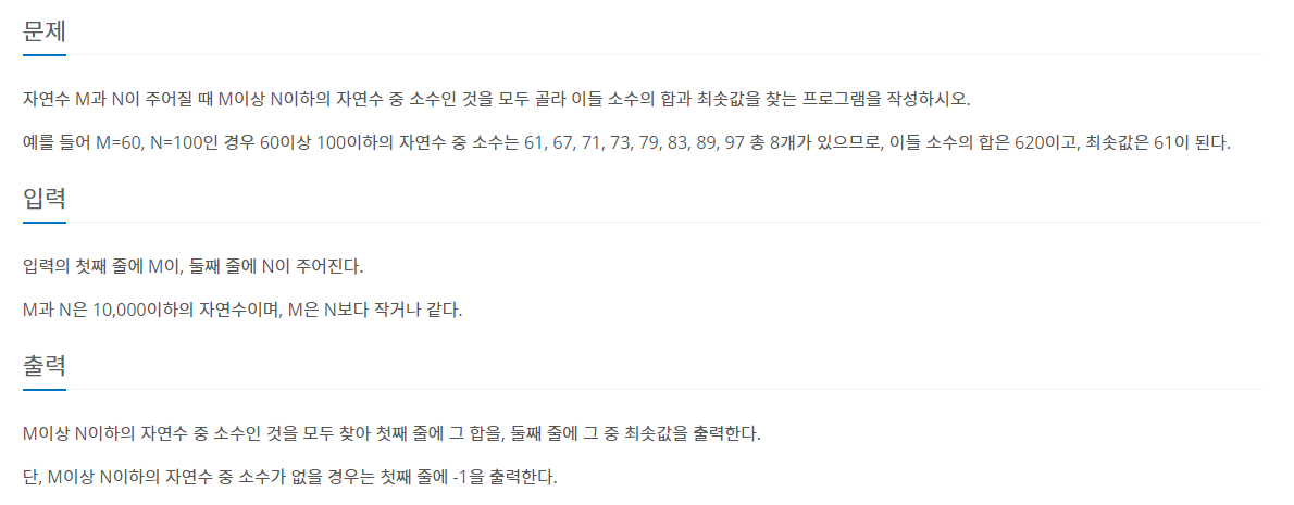M과 N 사이의 수 중에서 소수만을 골라 합을 구하고, 최솟값을 구하는 문제이다.