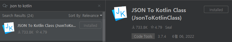 Android Studio > File > Settings > Plugins > "JSON To Kotlin" 검색 > Install