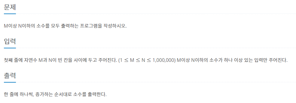 M과 N 사이의 수 중에서 소수만을 골라 순서대로 출력하는 것이다.