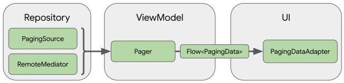 - 저장소 레이어 : 기본 구성요소는 PaingSource로 데이터 소스와 이 소스에서 데이터를 검색하는 방법을 정의한다. PagingSource 객체는 네트워크 소스 및 로컬 데이터베이스를 포함한 단일 소스에서 데이터를 로드할 수 있다.